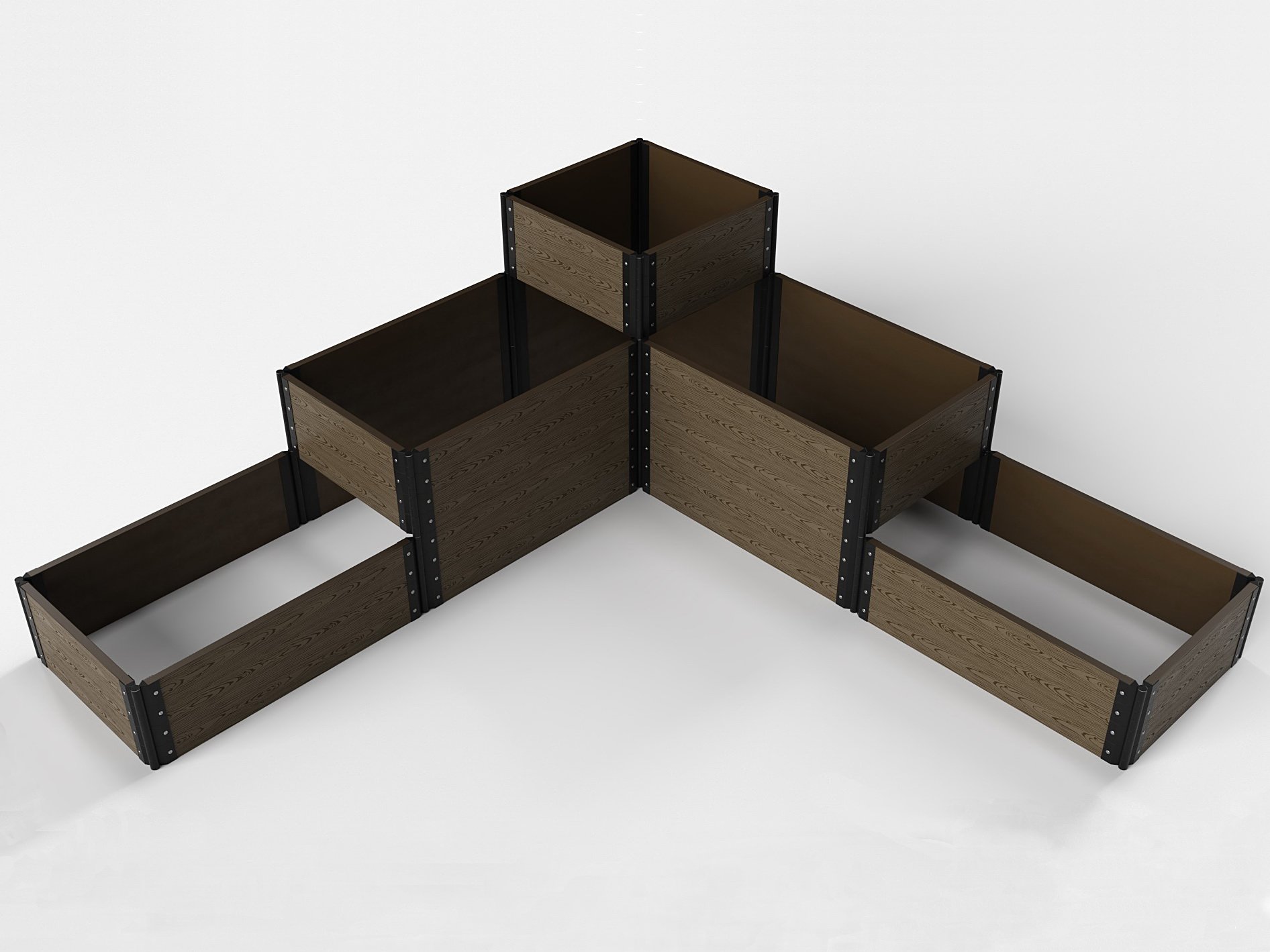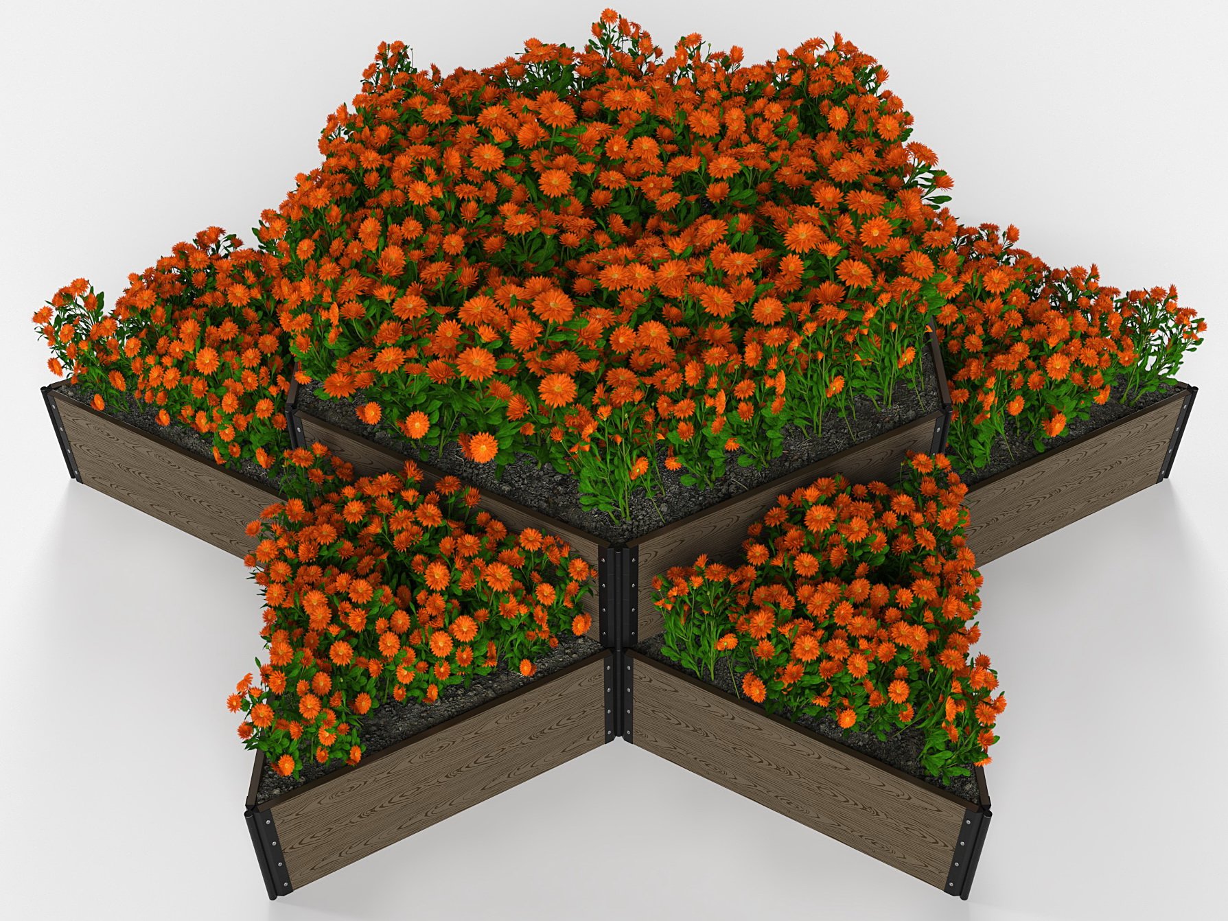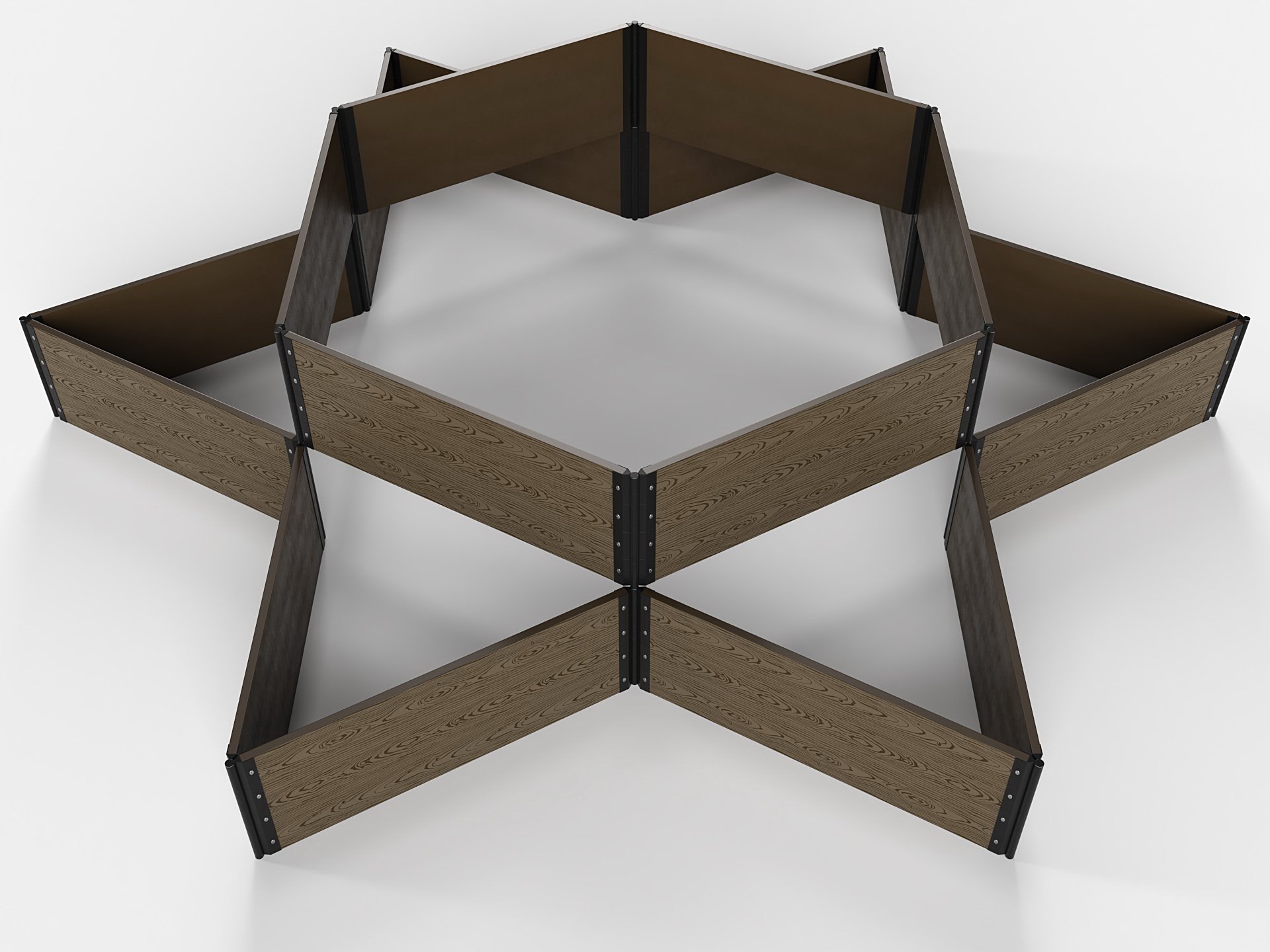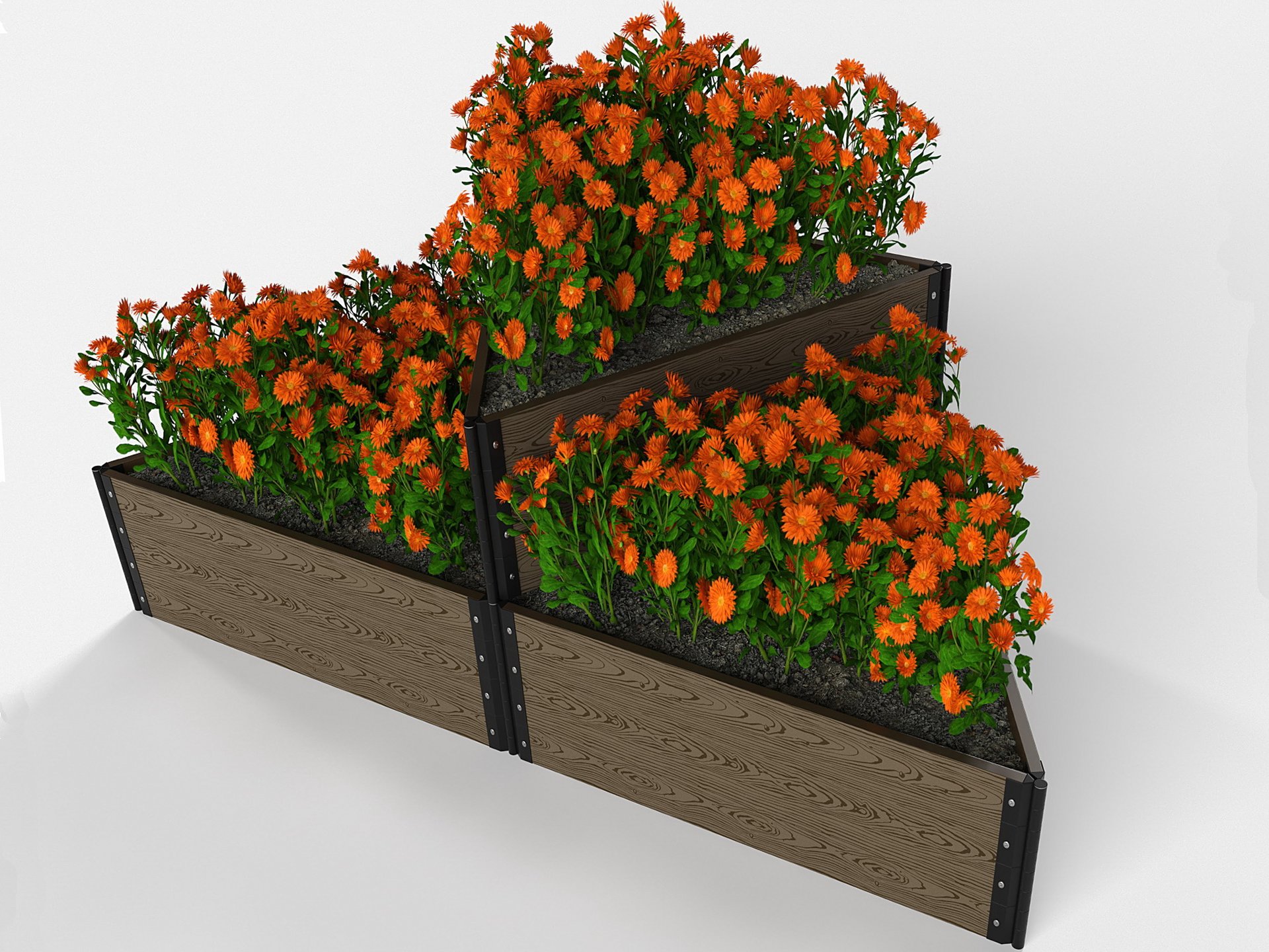 Именно такими являются высокие клумбы и цветники из ДПК с поворотными фрагментами для возможности создания разнообразных фигур. Например, представленные в фотографиях изделия позволяют создать одноярусные клумбы треугольной, прямоугольной формы и в виде звезды, буквы «П» и других символов.