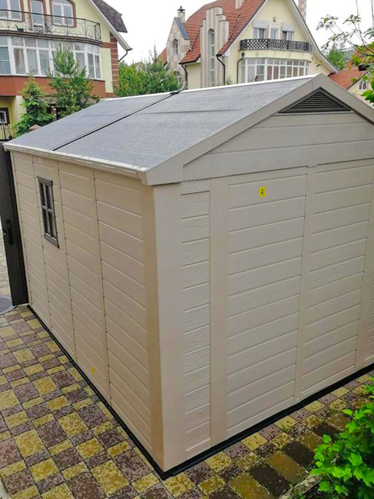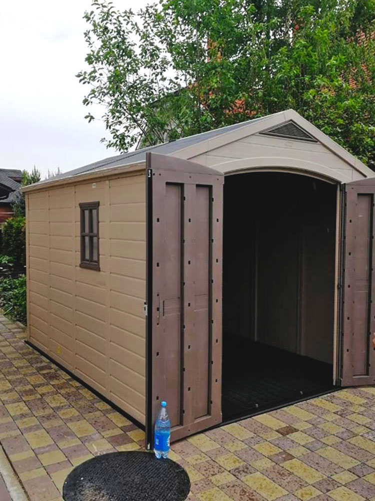 Сарай из высококачественного пластика, не подвержен деформации и устойчив в условиях высокой ветренности, жары и высокой влажности. В конструкции используются стальные стержни, что усиливает конструкцию, а прочный и плотный пластика не дает деформироваться конструкции.