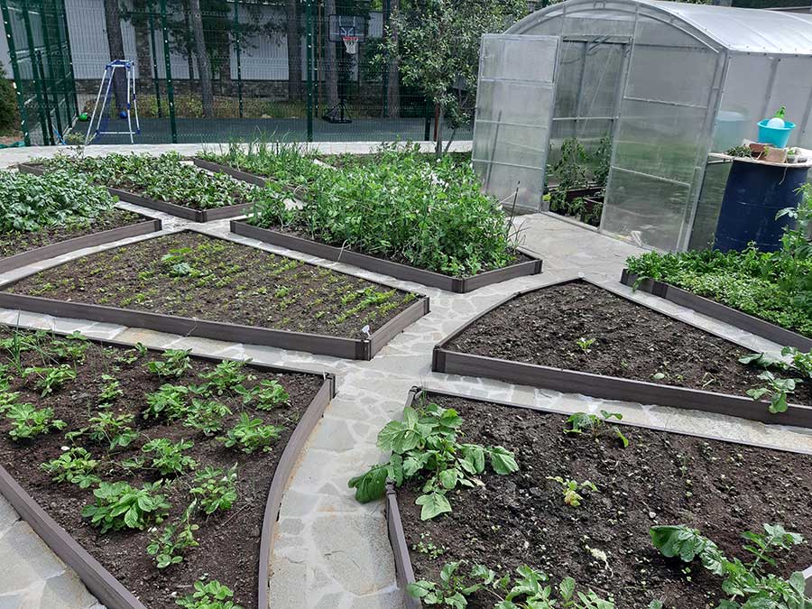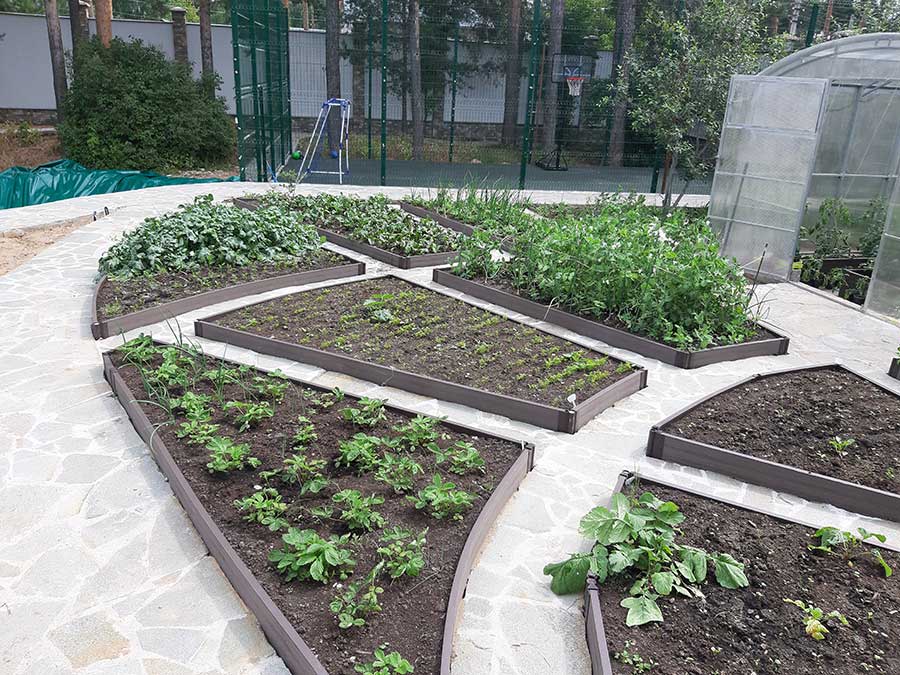 На участке установлены разных не прямоугольных форм грядки из ДПК Holzhof высотой 15 см с угловыми крепежными элементами из пластика. Грядки утоплены в землю (ДПК не боится влаги и не гниет), между грядками дорожки выложены камнем.